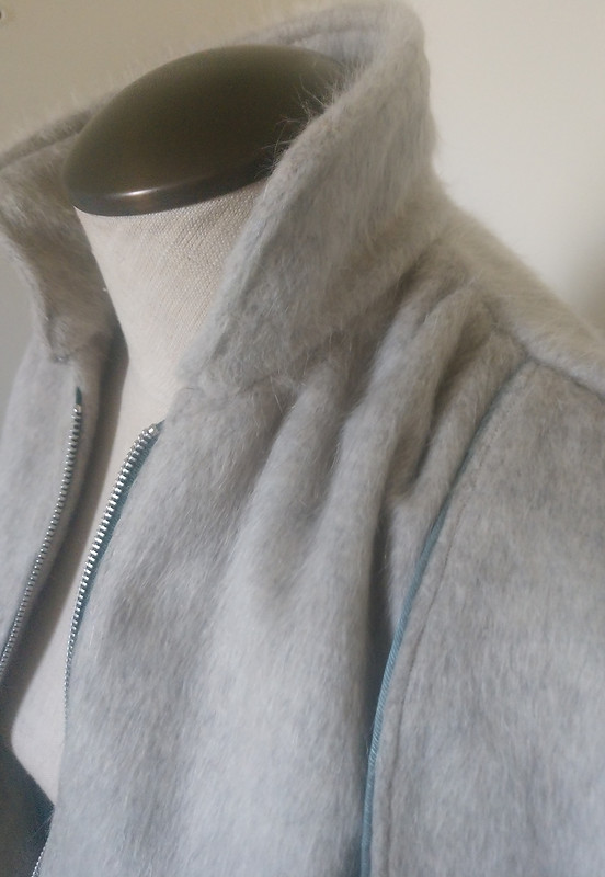 The lining fabric is an iridescent polyester twill, and the shell is bone grey Italian mohair.