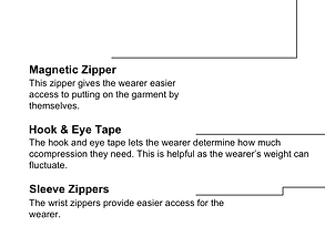 The final garment has a magnetic zipper down the front to help those with dexterity issues get dressed by themselves. There are three rows of hook and eye tape down the side of the bottom half of the garment. This allows the wearer to wrap the bottom portion of the garment around themselves. This helps the wearer as they gain weight, they can adjust the bottom wrap according to how much compression they need. There are also zippers at the wrist opening to allow the wearer to get the garment on more easily. The garment is made with PurThread Cotton. The purpose of using PurThread cotton is the benefit of the antimicrobial properties. The antimicrobial properties help fight infection and prevent bacteria from forming. This garment is also machine washable.